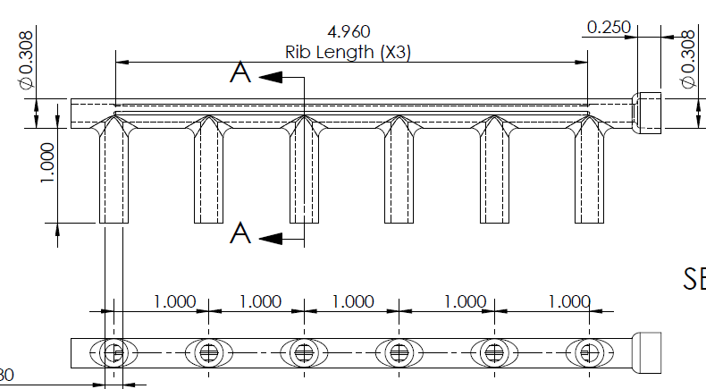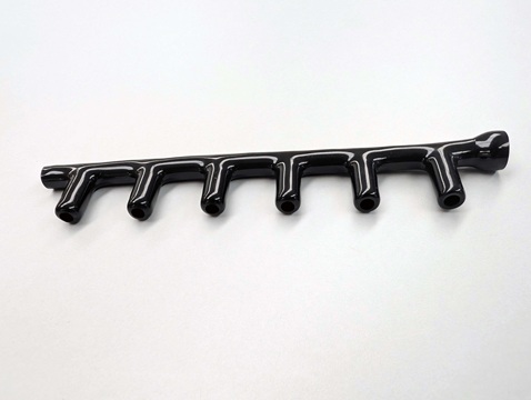 • Info: 6" long water circulation manifold.  1" long ports one inch apart for interference fit with copper tubing utilizing a clamp.  Bell end would be solvent bonded to tubing. Interior of manifold was designed with an internal rib to prevent blocking water flow if crimped.